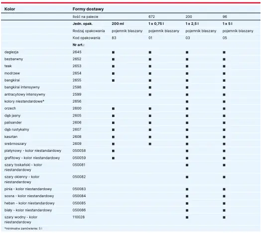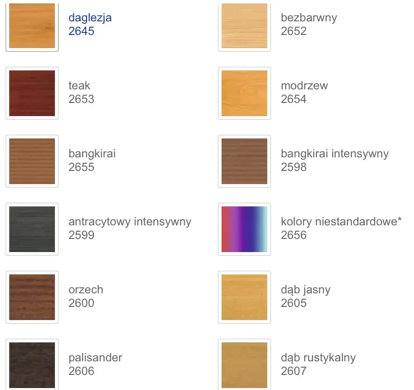 - Kolory są dopasowane do danego gatunku drewna, można je jednak bez problemu zastępować na innych gatunkach. Kolor będzie się wówczas oczywiście różnił od zawartego we wzornikach.